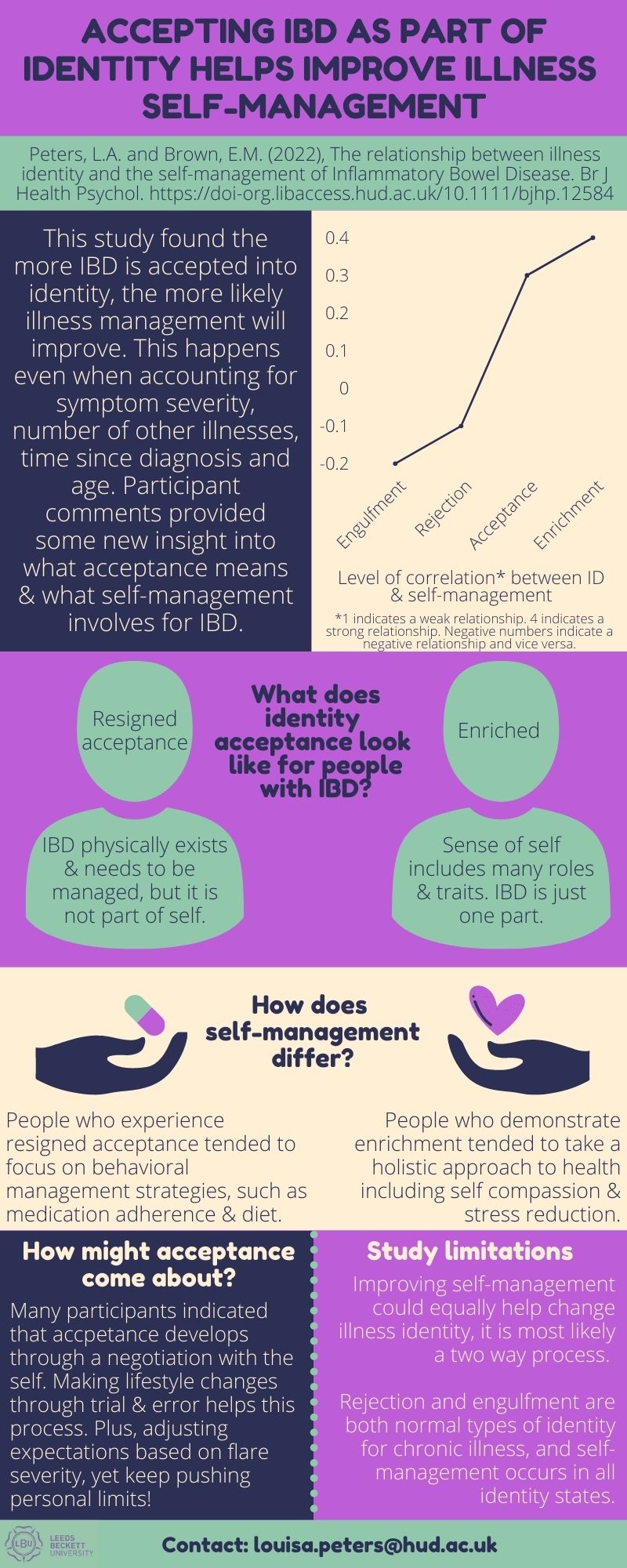 The research findings have been published in the British Journal of Psychology: Peters, L. A. & Brown, E. M. (2022). The relationship between illness identity and the self-management of Inflammatory Bowel Disease. British Journal of Health Psychology. https://doi-org.libaccess.hud.ac.uk/10.1111/bjhp.12584