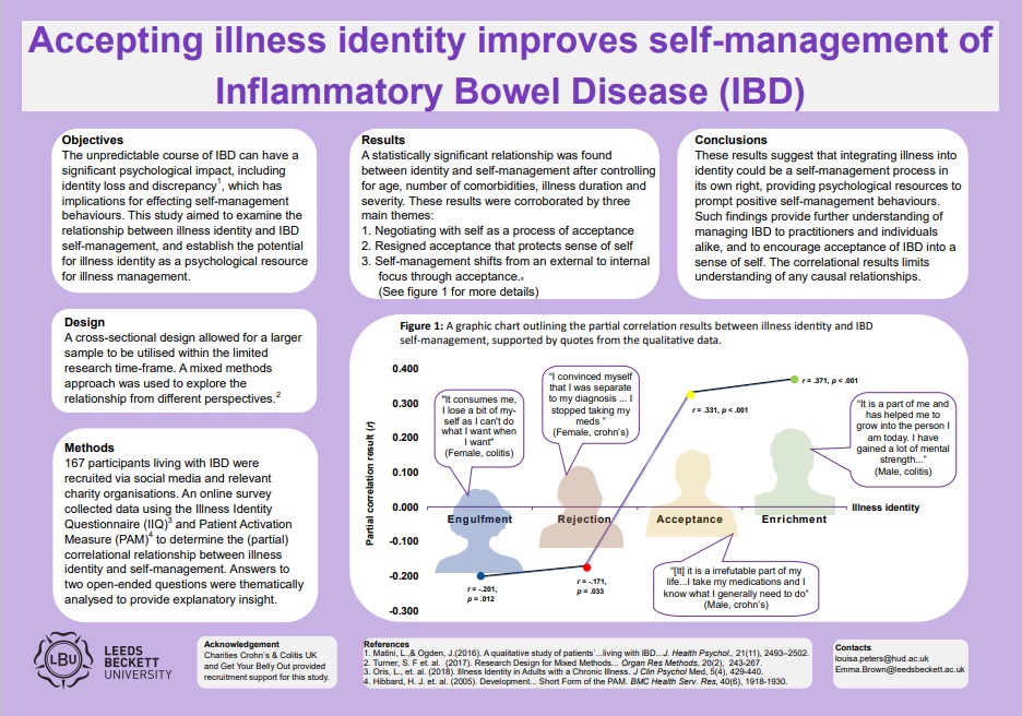 A poster of the research was presented at the 2021 BPS Division of Health Psychology Annual Conference: Peters, L. A. & Brown, E. M. (2021, June 29). Accepting illness identity improves self-management of Inflammatory Bowel Disease (IBD). [Poster Presentation]. 2021 BPS Division of Health Psychology Annual Conference, UK. https://tinyurl.com/m75f924w